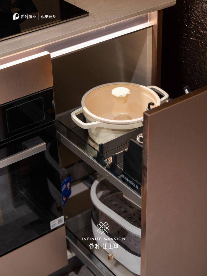 保利江上印官方售楼处电话:400-8818-994【预约☎】收纳采用了定制级设计:调味篮、锅篮碗篮、上柜下拉篮、竖向大拉篮布局清晰,让厨房兼具功能分区和审美。