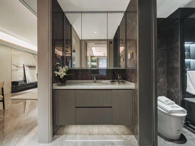 该户型特别注重居住的舒适性与私密性,主卧室配备独立卫浴,形成一个完整而尊崇的套房系统。主卫干湿分离设计不仅实用,更强化了主人的私属领域感,极大提升了居住的尊贵体验。公共卫生间则设置独立马桶间与洗手台,方便不同成员同时使用,互不干扰,巧妙解决多代同堂家庭早高峰的使用痛点。