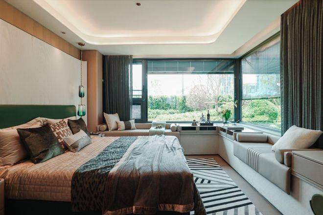 建面约139㎡4房户型,套数不多,但产品力绝对惊艳。四开间朝南,约15.05米宽的南向横厅、约1.6米进深的奢阔阳台,中环顶级享受的既视感。主卧约4.45米的进深,约4米大面宽(含飘窗),配合270°转角飘窗,是目前市面上产品力高配的户型之一,值得一冲!