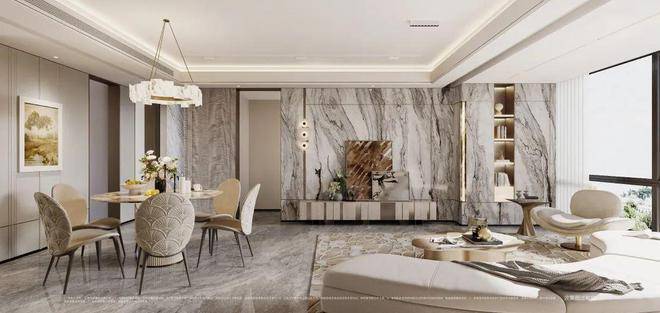 诠释会所奢华感的是拥有艺术水景吊灯、配备智能化系统的私宴厅,吧台由整块瑰丽的香格里拉绿奢石一体打磨,还有一个16座的超大圆形餐桌。