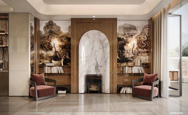 地面依据场景切换石材拼花——公区是对纹拼接,日光书屋是源于老派洋房工艺的荷叶拼花地砖......