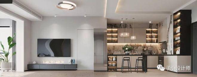 考虑到男主人身高与房屋层高的因素,没有全屋吊顶,而是采用局部边吊来隐藏空调风管机与厨房管道的目的,并用灯带处理,以达到整体美观的效果