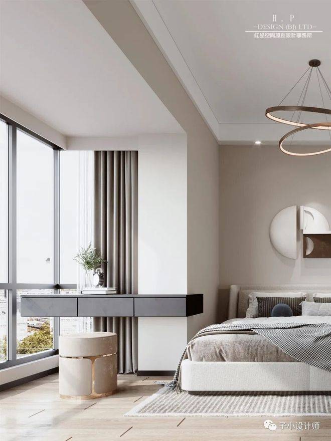 卧室的设计素雅温馨,使用大地色配色更加耐看,且由于色彩倾向弱,明度低,有助于睡眠休息~