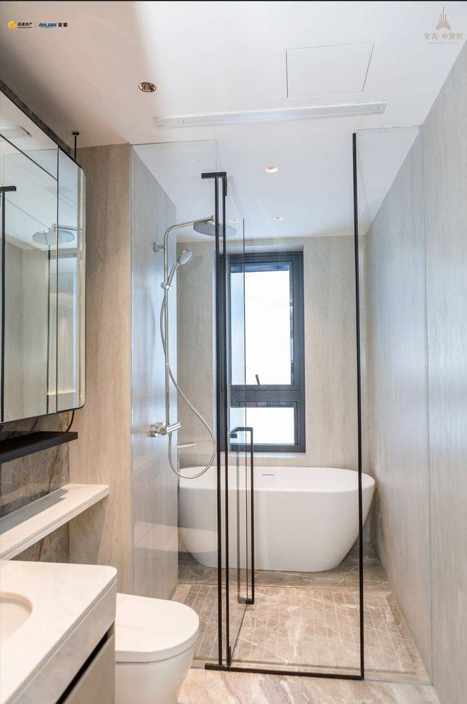 主卧是270°转角大飘窗,并且配置独立浴缸,通长镜柜,置物架。