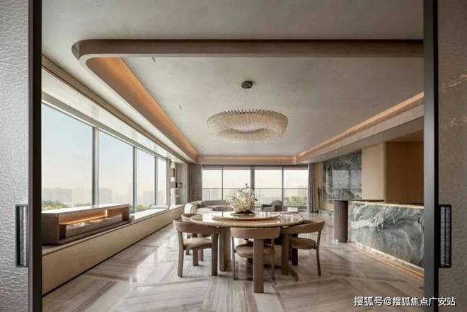 再次,该户型的公区设计尤其出彩,客餐厅厨房一体化设计外接南向大阳台,公区的尺度感做到极致,并且将面积极致利用。
