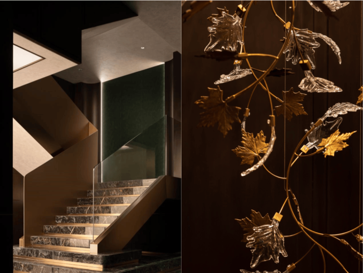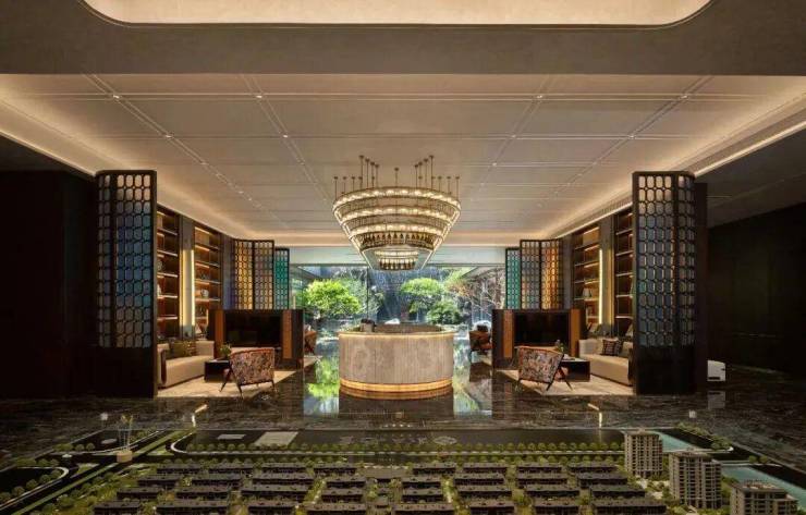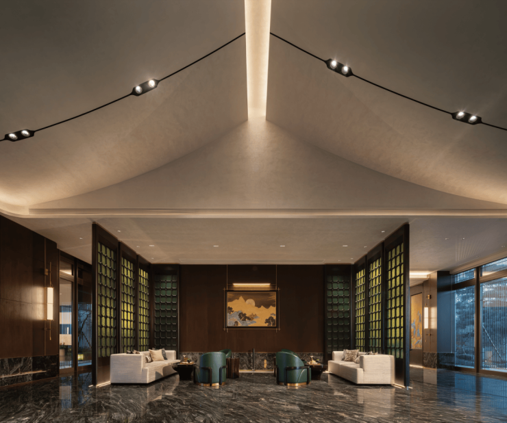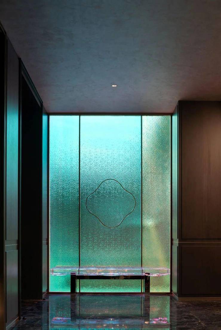 步入首层大厅,天花以流动的线条勾勒出水波荡漾的意象。通透的官绿色屏风采用水纹艺术工艺,通过「透景」手法,令此空间在屏风处形成「画中游」的视觉蒙太奇,形成视觉上的遮与引。