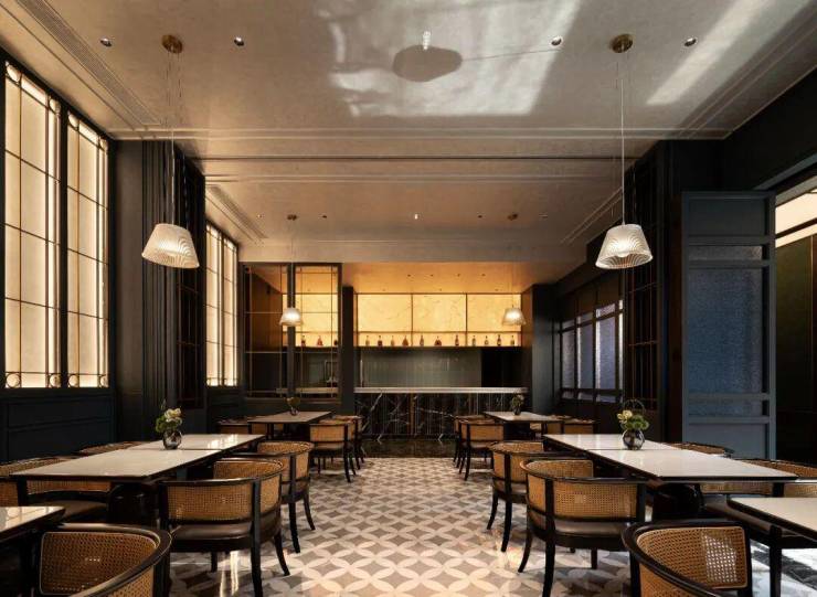 空间以江南十二色的鸦青色为主轴,取意"雨过天青云破处"的东方色韵。通过解构园林建筑的语言元素,营造"移步易景"的当代餐饮体验。墙面镶嵌雕刻的漏窗纹样,重现留园"移天缩地"的造景智慧,营造出"推门见景"的仪式感。