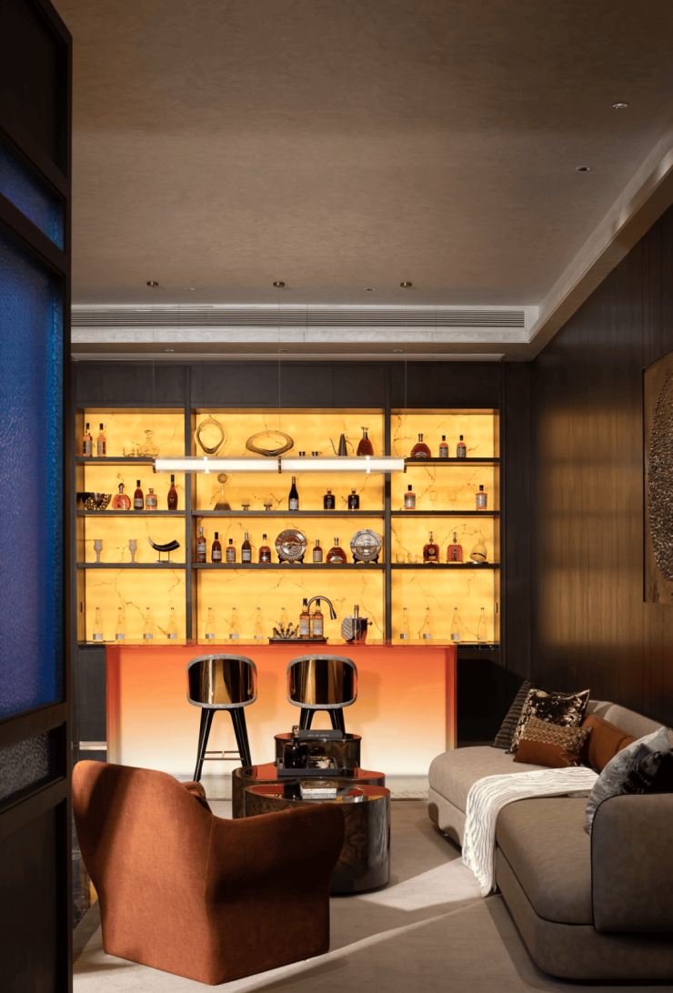 步入雪茄吧,橙色渐变设计的吧台与整面透光的玉石酒柜,隐约散发出尊贵的气质。
