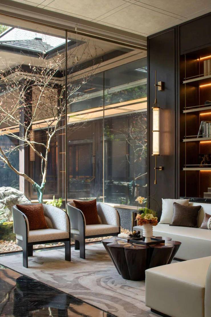 室内四季流转,窗外景致一览无遗,窗内诗意画作与之呼应。胜景与意境相融,留白与节奏把控严谨,不着痕迹地营造出难以复刻的宁静与隐奢。