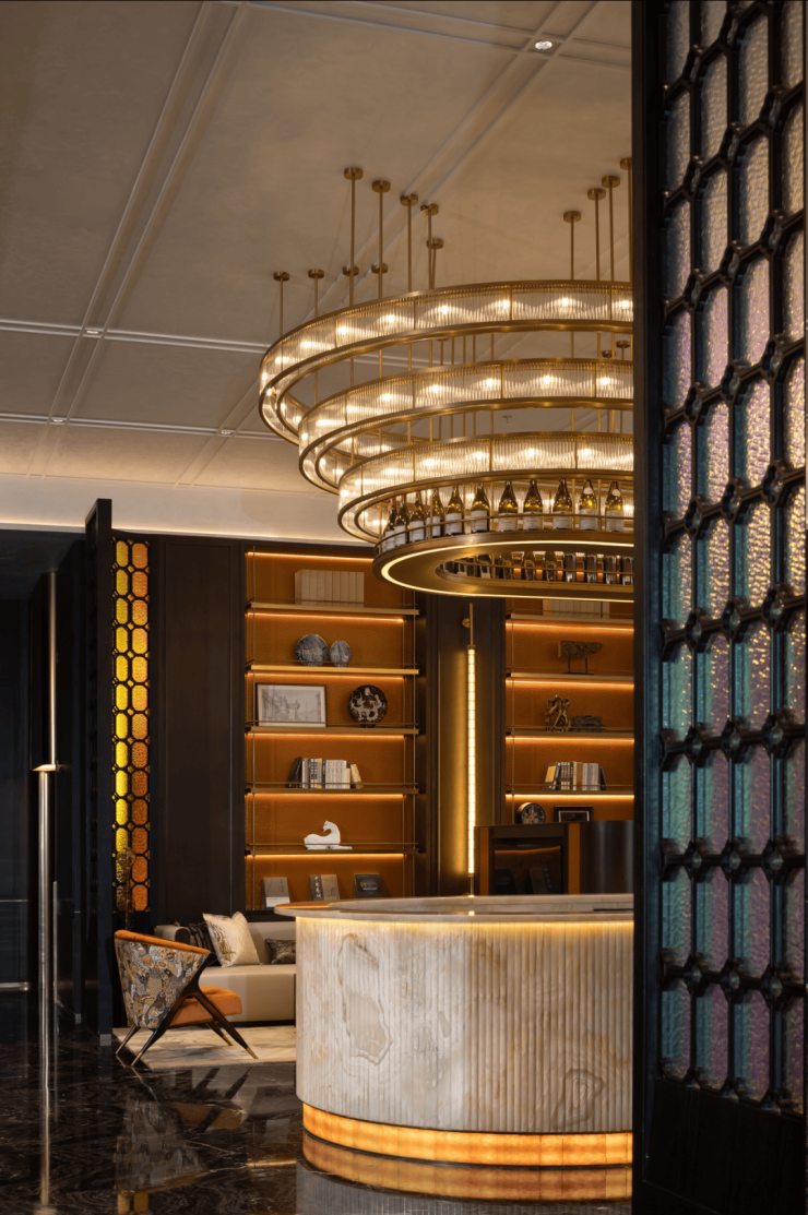 两侧的七彩玻璃在粼粼波光的映衬下,流露出江南十二色般的温婉意境,与苏绣沙发相得益彰。水吧台精选玉石与层次分明的水晶吊灯巧妙搭配,既保留了天然玉石的温润质感,又以现代极简风格诠释了空间美学。