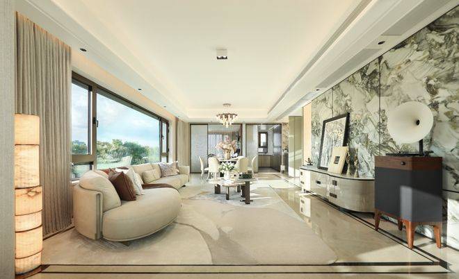 【约102㎡样板间】三房两厅两卫格局,同样的布局设计巧思应用于102㎡,打造出近乎双套房的生活体验。5米面宽横厅设计,营造极致通透感,臻选奢石融入空间,优雅时尚。厨房科学动线设计,搭配国际品牌五金和厨电,悦享精致烹饪时刻。星级主卧,独立卫浴,将空间最大程度延伸,打造舒居体验。