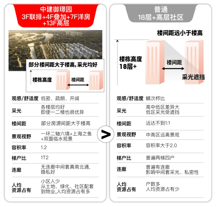 而中建御璟园不仅是这稀缺的低密住区之一,得益于其叠墅+联排+小高层+洋房的产品组成,项目的宜居性、视野、采光、人均资源占有率以及居住舒适度等全维度的表现都非常出众。