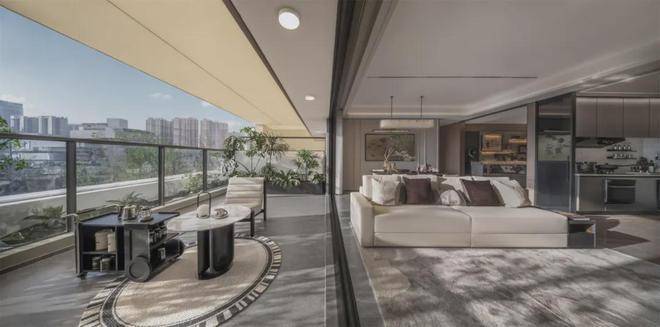 南向约14.5m超大面宽,三卧朝南布局,这一面除了必须的墙体,都是玻璃和露台。项目约40㎡LDKG一体化大方厅,气场全开,布局上社交、观景空间连成一线,呈现了大家族才有的排面。