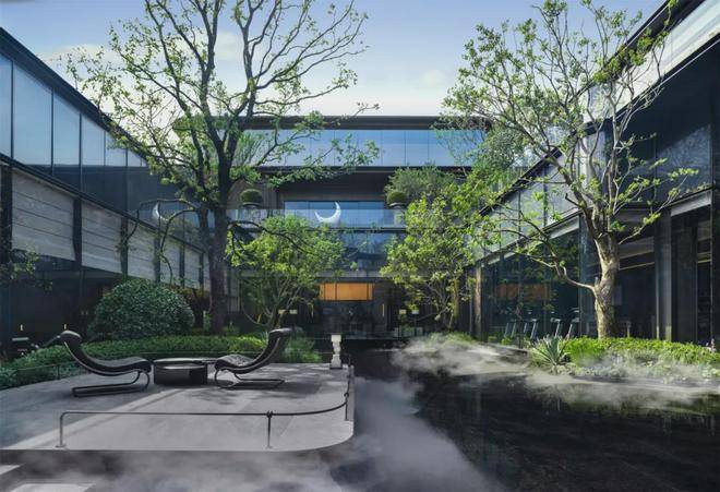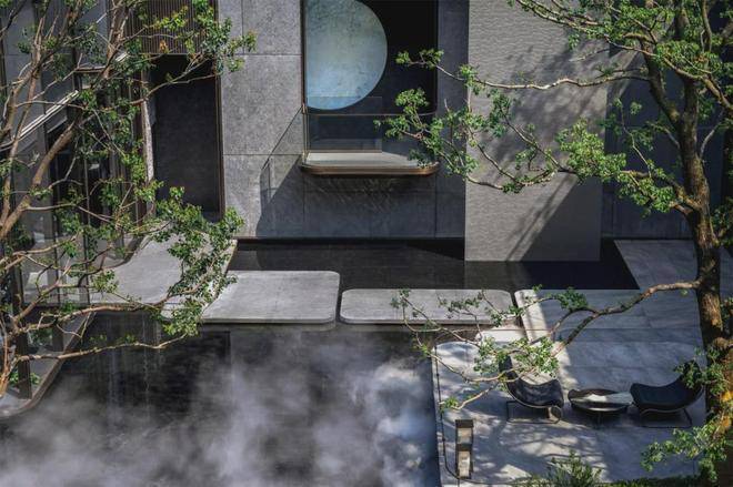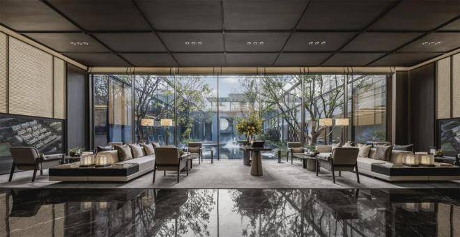 景观放大了树和水的元素,主要选用树王级稀贵树种,大面积的下沉式镜面水庭,中间缀以石材形成岛屿般的汀步、蜿蜒的岸线、碧波枕弦月,弧形的运用让艺术美感在园林里自由穿梭,也辗转出不同的场景韵味。