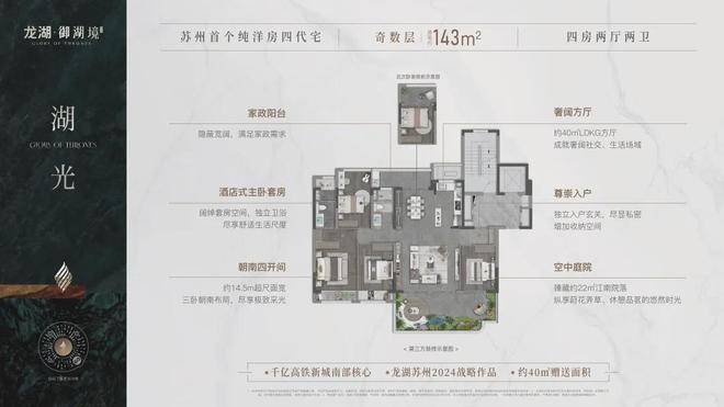 龙湖 · 未来御湖境--苏州首个第四代立体生态住宅。项目总建筑面积124482.08平方米(未含露台部分面积),总计容面积82950.40平方米,容积率1.6,绿地率37%,建筑密度24.98%。空中庭院面积达约20-50㎡,均约6m挑高,最大270°转角视野。
