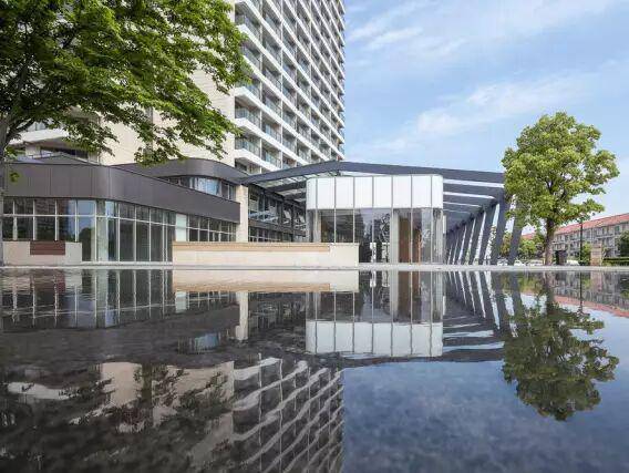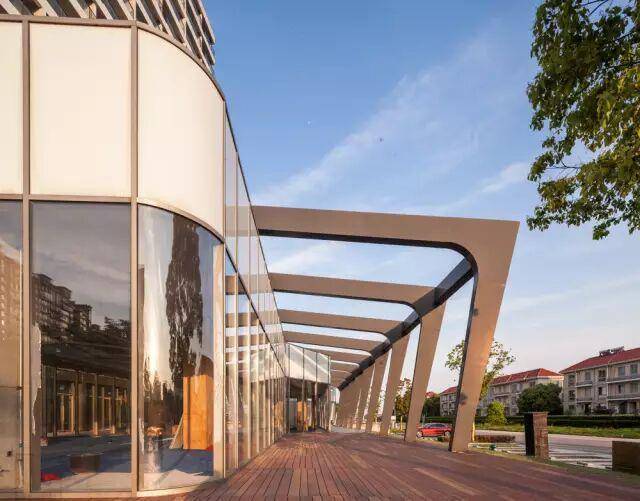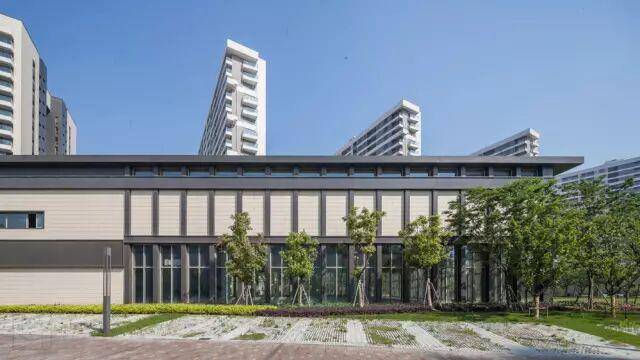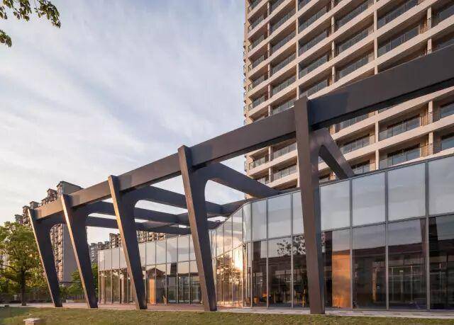 物管中心通过混凝土板展现着建筑的体量和敦实,并透过大面积的玻璃实现室内外空间的交流与对话。它与公寓大厦都运用着类似的建筑语言、材料、色彩和光影效果。