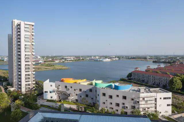 孩子们的教室空间和室外活动场地均朝向东菇河湖面。