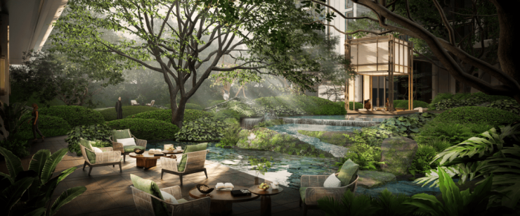 整个社区的景观强调“自然渗透”,叠水瀑布、外摆空间与完全敞开的架空层融为一体,营造出松弛感。