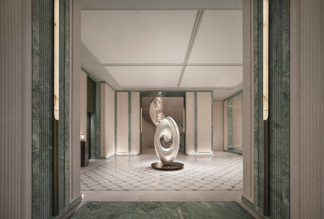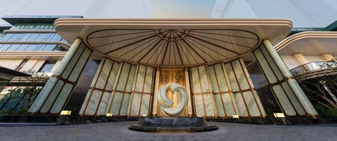 以杭州折扇为灵感而造的约56米超尺度门庭,形制舒展,寓意“藏风聚气”。12片巴西进口百达翡绿玉石屏风,温润围合。