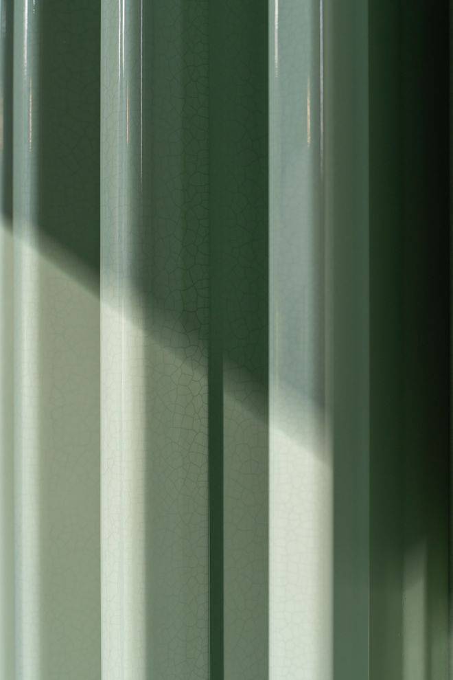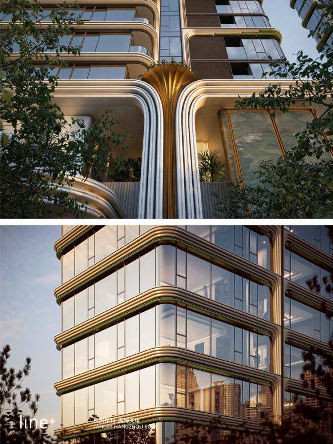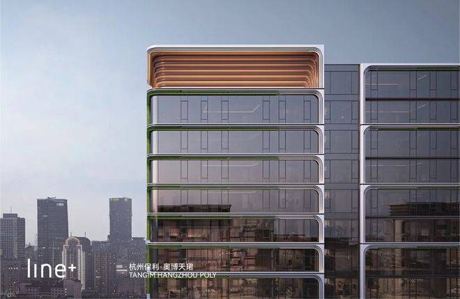 天珺的建筑立面由LINE+朱培栋大师独创的设计,获得了国家建筑美学专利。设计摒弃了早期对海外风格的简单复制,将龙井春芽、钱塘潮水、南宋官窑等元素融入建筑,最终塑造出独特的“钱塘春芽”立面——青绿色彩釉陶板如嫩芽般包裹建筑,细节处的冰裂纹理暗藏宋瓷韵味,为奥体打造了真正具有杭州辨识度的建筑符号。