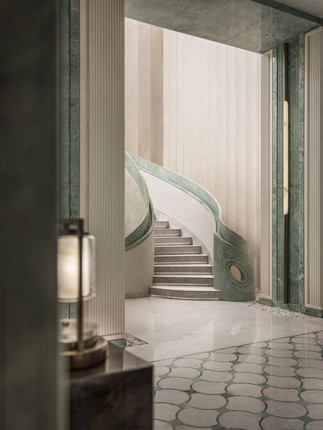 旋转楼梯中央,玉石灯柱如垂瀑而下。光影在每一寸玉质间律动、折射。