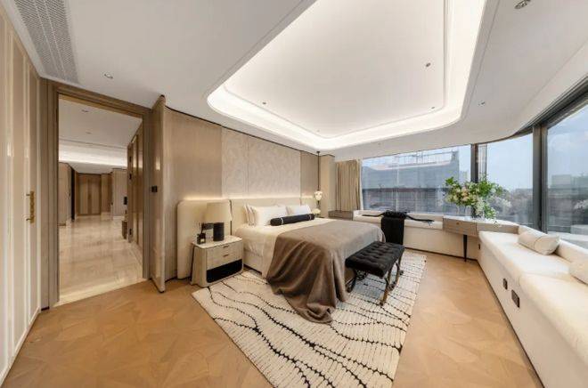 主卧270度转角飘窗,L型全景采光面,不仅将南向园林与北侧城市光影尽收眼底,更创造了一个沉浸式的观景休憩角落。与之匹配的L型衣帽间,实现了衣物、配饰与箱包的系统化收纳。同时还预留保姆家政间,客厅阳台封闭后仍保留多阳台&设备平台,兼顾观景与实用晾晒。