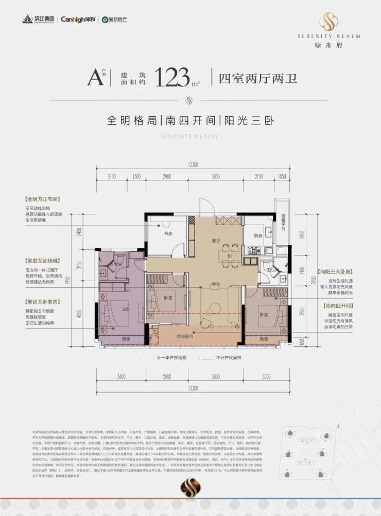 约13.3米的南向采光面,四开间朝南、三卧朝南,让生活沐浴在阳光里,在同面积段产品中实属难得;LDKB布局,卧室自带飘窗,主卧臻配独立卫浴,可以说是初改置业的福音;北向还拥享一方书房空间,可改造成茶室、电竞房等,轻松实现“悦己人生”。