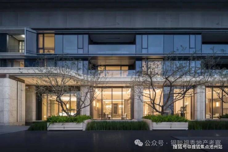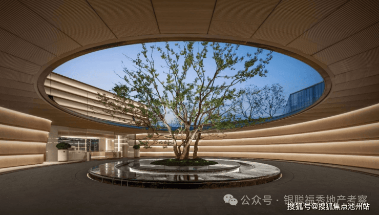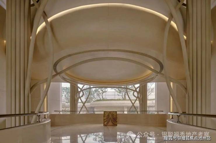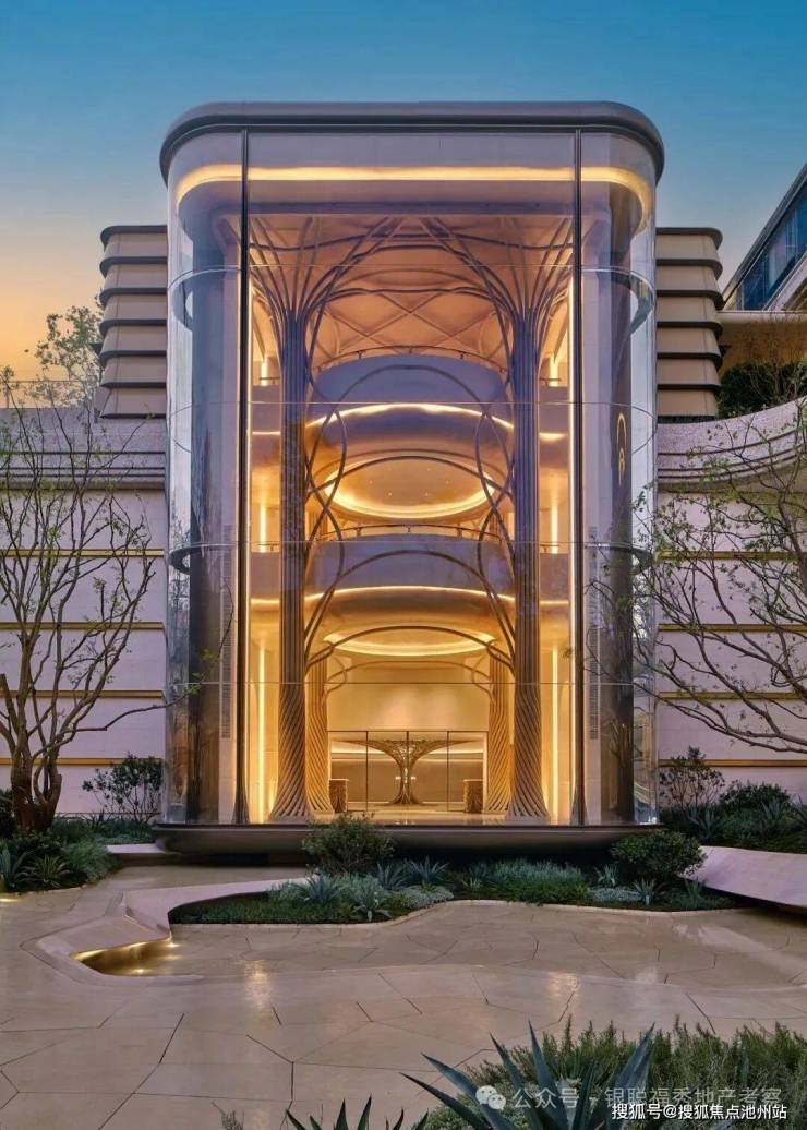 大门内外两重门厅景墙运用月光米黄石材近1000 方,搭配香槟金金属线条,汲取爱马仕全球旗舰店的双曲面叠墙造景手法,增加景墙奢华质感。 项目沿河的楼幢整体上抬,也就是——抬地式。好处在于地库通风,客户行车归家动线更合理。