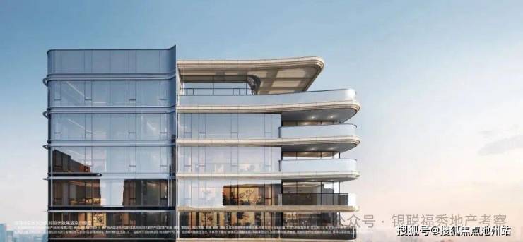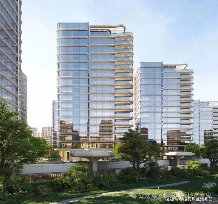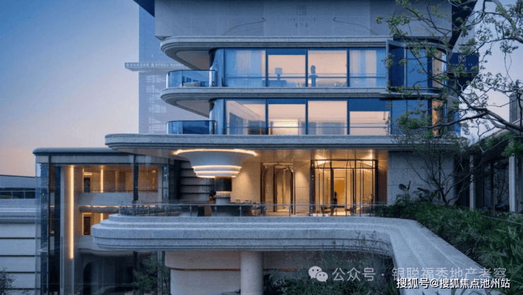 外立面采用弧线转角阳台+蓝灰色钢化LOW-E玻璃,公建化立面拥有超高窗墙比。同时,大量曲线元素的运用,不仅造价昂贵,而且极具辨识度,成为区域的颜值担当。