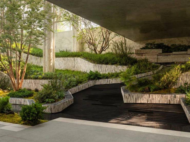 在这个立体悬浮世界里,有着天台层、归家层和下沉庭院层的垂直景观布局。从穿长廊的登高望远、到见溪潭、叠流韵的曲水流觞,再到揽河景、探幽境的探幽寻密。