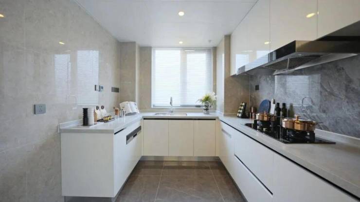 厨房配备了西门子三件套,还有贝朗大单槽;就连灶台墙面也铺上了整面岩板,这可是单价3万出头的装修标准。深U形厨房设计兼顾了美观和实用性。这种设计不仅为备菜和烹饪提供了充足的空间,还使得厨房操作流线更加合理,无论是家庭聚餐还是日常烹饪,都能保持高效和顺畅。