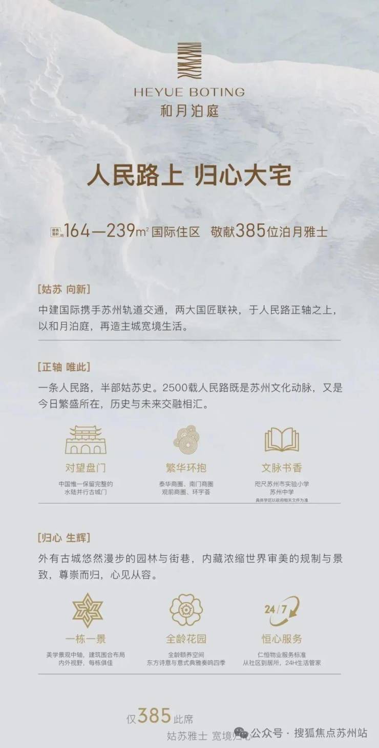 建筑西立面和阳台上方檐口用木纹铝板勾勒出古城屋檐的轻盈剪影,在复刻的「披檐」形制与花窗纹格里,触摸到传统与现代的共生密码,园林归家动线以镜面水景和几何光影演绎现代美学。正如一位业主所言:“这里不是‘占据’地段,而是让地段自然生长进生活。”✅中建和月泊庭售楼处电话:400-9016-520✅︎✅︎✅✅苏州中建和月泊庭营销中心热线400-9016-520(官方预约看房热线)