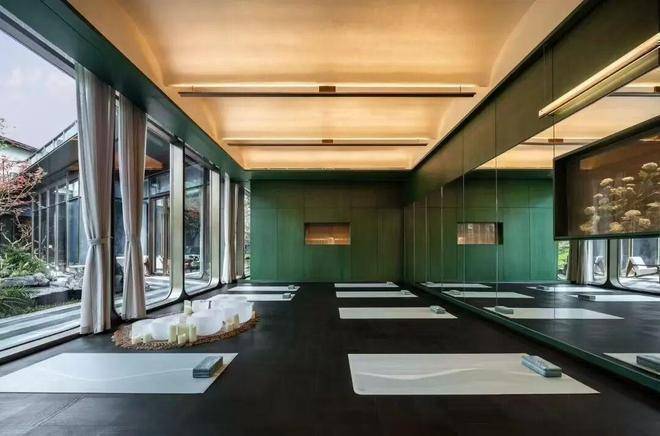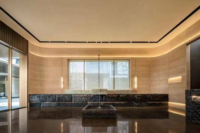 在这里,石材成为空间情感的导体——玄石砚台承雨链是为听苏州,亚马逊绿奢石台是为触江南,统一的青绿色谱是为达成空间与“玉”的对话……