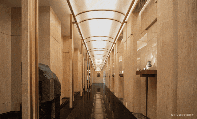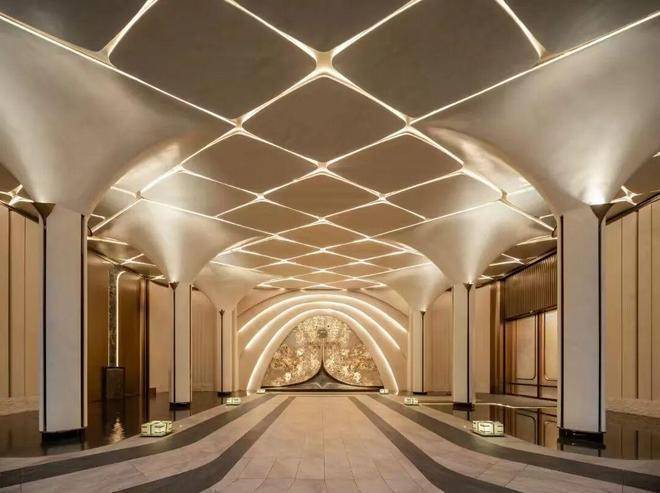 阵列间穿插铺设透光云石,搭配智能化灯光控制原则,灯光车行随亮,打造出集古典美学、智能科技与艺术光影于一体的美学空间。