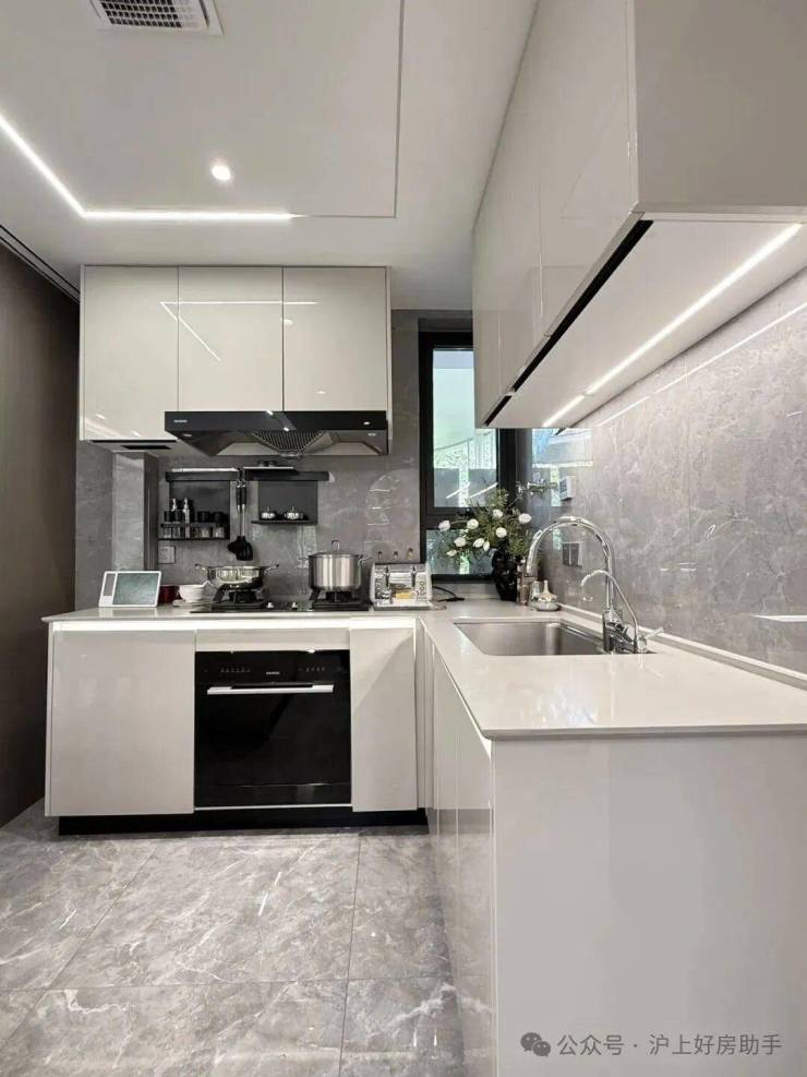 橱柜收纳系统:特别预置洗碗机点位、柜内下拉篮式设计、不锈钢挡油板、柜下操作灯、烹饪全流程功能动线一体化设计;