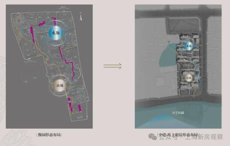 社区内部,设计团队以豫园为灵感蓝本,运用现代手法重新诠释豫园的“山脉”与“水脉”,打造出一座立体起伏的山水园林。