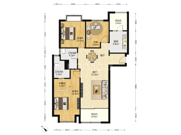 建面约135平3房