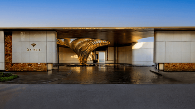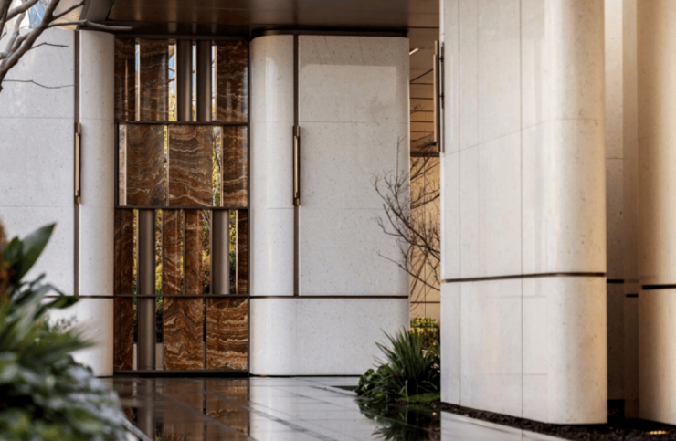 不仅是金钱上的奢侈,更是时间广度的奢侈。比如,整个下沉式庭院材料选用土耳其进口老虎玉,由匠人耗时60天手工打磨定制,可见海上·清和玺对业主归家仪式感设计的用心与苛求。海派光厅之外的归家迎宾树木更是由设计师辗转多个城市才寻到的、树龄超60年的福木“紫薇”。
