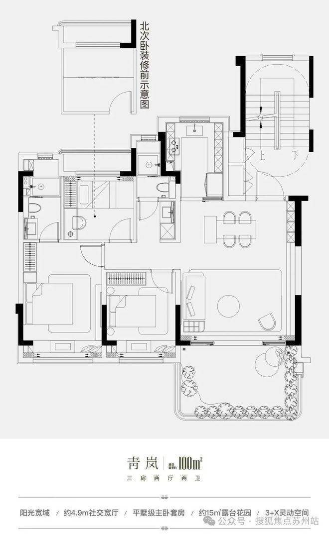 青岚户型 建筑面积约100㎡ 三房两厅两卫阳光宽域|约4.9m社交宽厅|平墅级主卧套房|约15㎡露台花园|3+X灵动空间