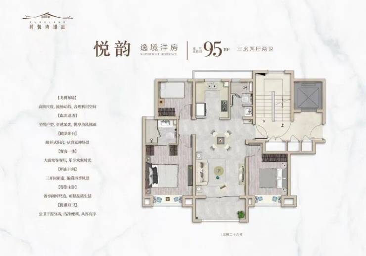 得房率约 86%,适合年轻家庭,楼上楼下的设计,既有私密空间又有互动区域,还有特色露台,可以很好延展大家庭的生活情景,套房式主卧预留衣帽间,南北通透的全明户型,让阳光与清风成为家的常客。