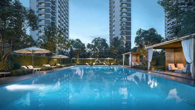一到夏天,池子里溢满了湛蓝的水,镶嵌在度假风的园林之中,远远望去,就像一块蓝宝石,将满未满,似溢非溢,满是高级感。