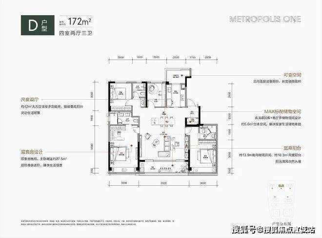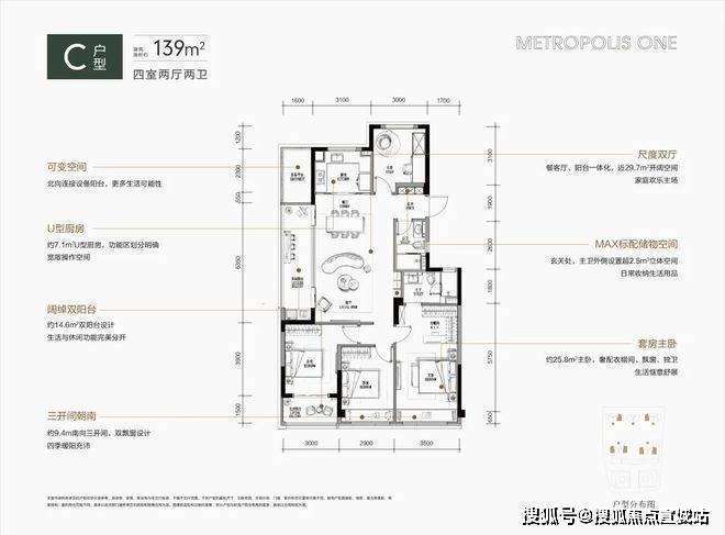 主力户型:3室2厅2卫(110㎡)、4室2厅2卫(128㎡、139㎡)、4室2厅3卫(172㎡)。