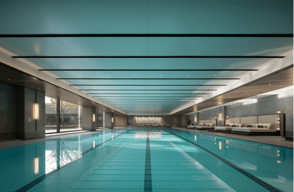 约2600平双首层地下会所仅向小区业主开放,配置25*11m半标恒温泳池,泳池配4条泳道,可满足健身、娱乐双重需求;约180平㎡私宴厅,酒窖、会客厅及健身房。围合式下沉庭院通过大面积超白玻璃,巧妙的将庭院自然景观过渡到室内,使得室内和室外景观“内外合一”。