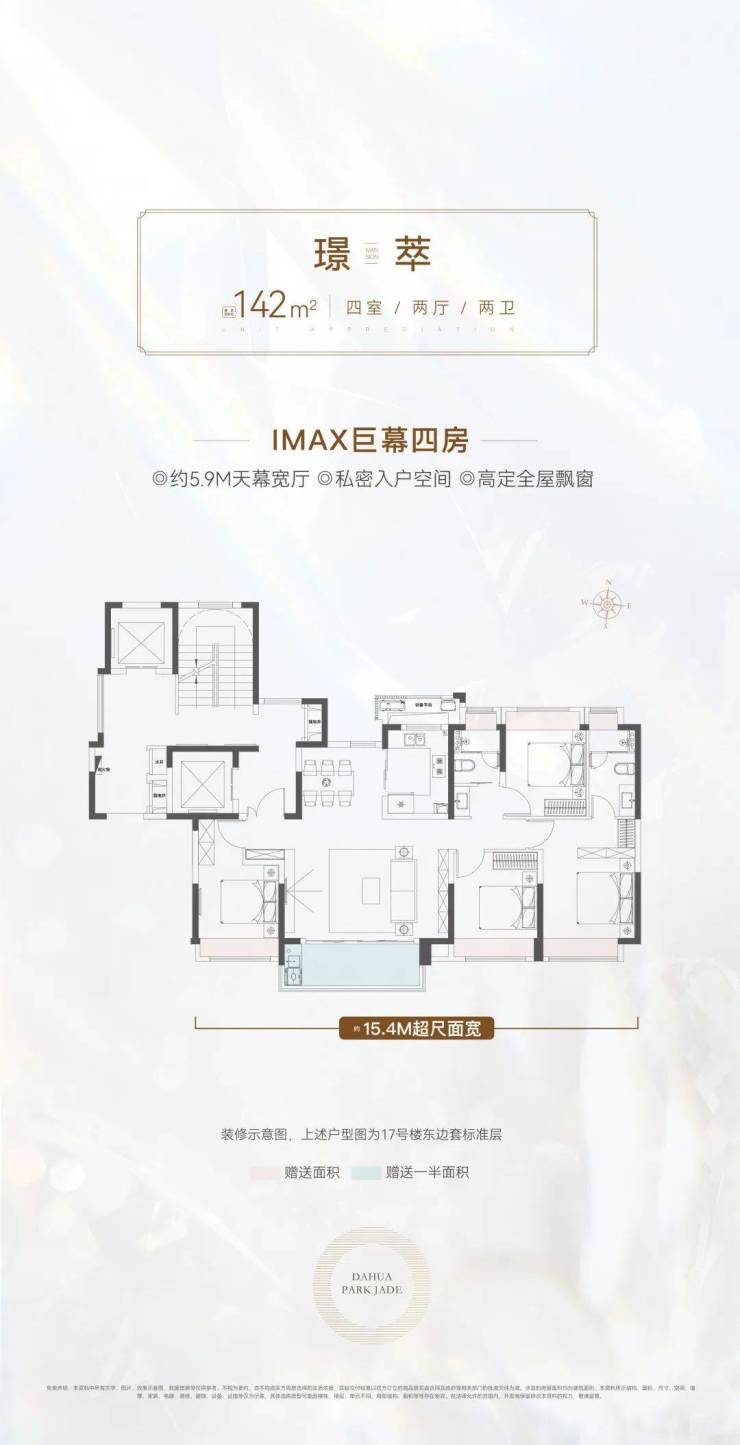 142㎡天幕四房:约5.9M阔尺宽厅/约15.4M南向面宽,宽载巨幕光景