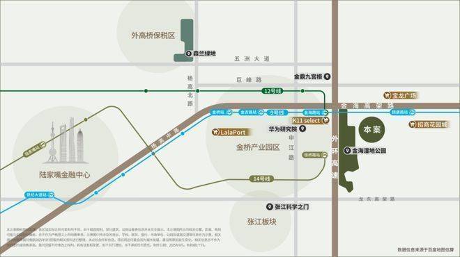 项目位于金桥东,金海湿地公园旁,9/12号双轨交汇,自驾出行的话周边有外环高速、金海高架路、往南还有龙东高架。从通勤角度来看,这是一个去陆家嘴、外高桥、金桥、张江都很方便的地段,可覆盖的人群非常广泛。