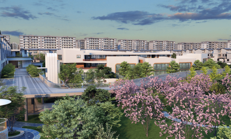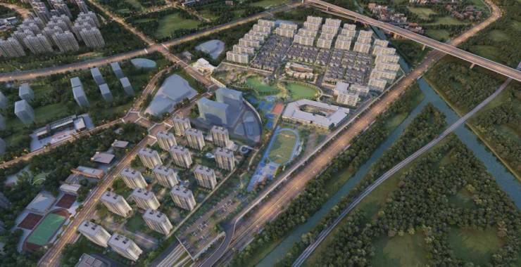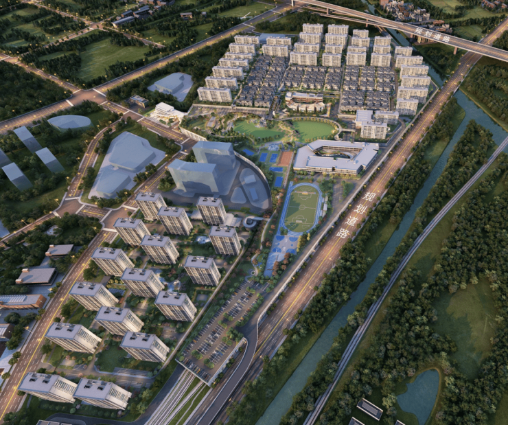 整个项目由两宗地块组成,占地约425亩,总建筑面积约48万㎡。是一座涵盖约4.5万㎡公园、幼儿园、九年一贯制学校、文体中心、邻里中心等复合业态的超大“公园城市”。