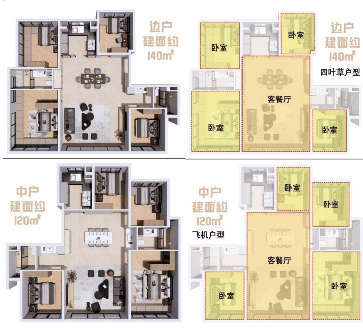 壹江臻邸首开的两个户型精准运用“四叶草”与“飞机”两种经典户型布局,将卧室巧妙分散于四角,从而将开阔方正的客餐厅置于户型中心,奠定了高效的空间格局。