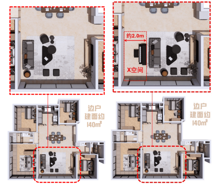 其中140产品约6m的面宽,可放置转角L型沙发,让整个空间更加轻松、自由;或者在传统沙发背后隔出宽度约2m的X空间,作为琴房或者健身角,充分满足改善型家庭多元化的生活需求。