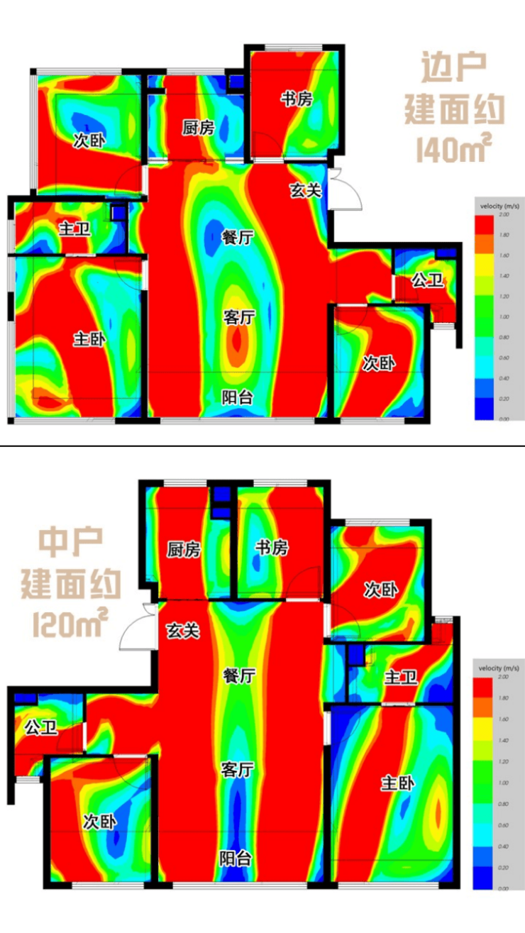 图上模拟计算的是在春夏季东南风环境下,户内的通风情况。颜色代表风速,红色最优,蓝色基本静止;箭头代表流动方向。从中可以看到,大部分房间都有最大风速的红色箭头,表示在开窗情况下,这些房间都有优秀的通风条件。