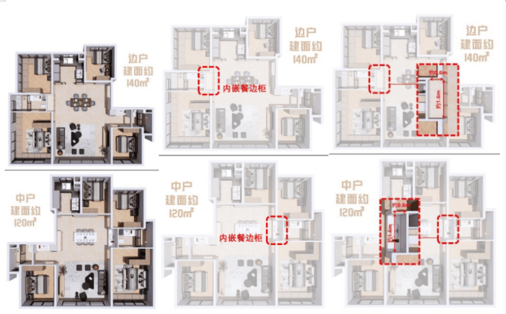 在壹江臻邸首开的两个户型中,我们还惊喜的发现有内嵌餐边柜的空间,净尺寸长度约1.6m,进深约0.6m。这种内嵌式设计,对于有宝宝的家庭来说,杜绝了独立式柜体外露尖角的安全隐患,将功能收纳与建筑融为一体,保持了客餐厅整体的方正与开阔。在保持大容量收纳的同时,还可配置水槽、咖啡机、酒柜等,升级为家庭水吧,提升生活品质。